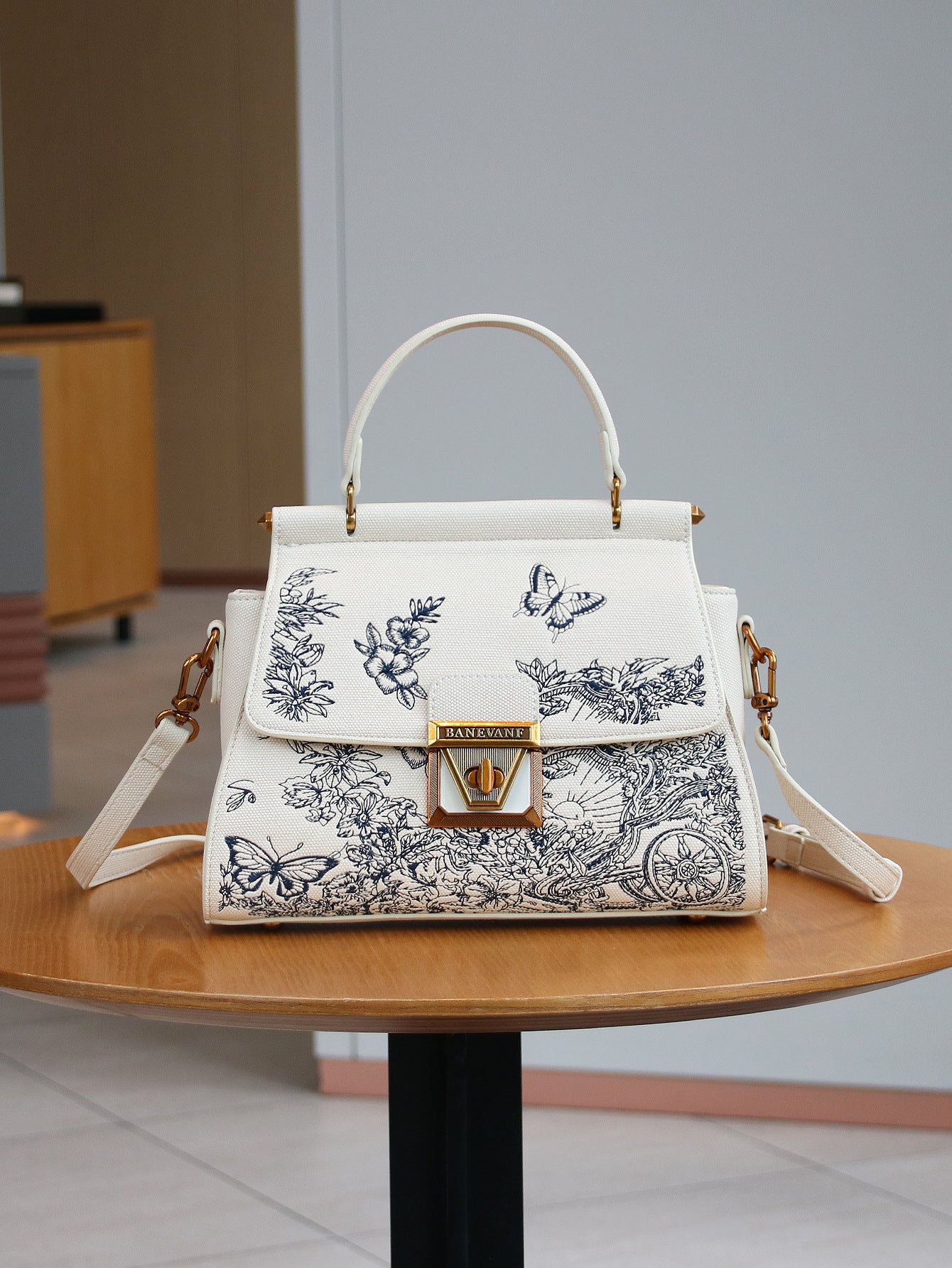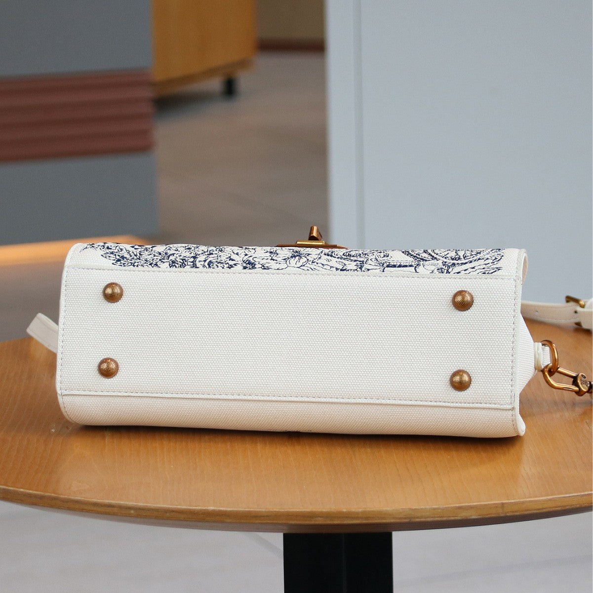 Experience the epitome of luxury with our Embroidered Canvas Saddle Bag. Meticulously crafted with an embossed pattern and ornate lock closure, this statement piece exudes elegance. With dual carrying options, it's not just an accessory, it's a wearable masterpiece. Elevate your ensemble from day to night with versatile style.